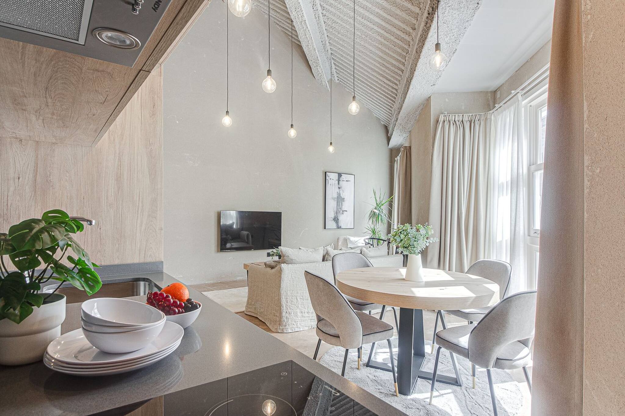 In the hotplate of glass ceramics open plan kitchen, refrigerator, microwave, freezer, dishwasher, dishes/cutlery, kitchen utensils, coffee machine, toaster and kettle are provided.